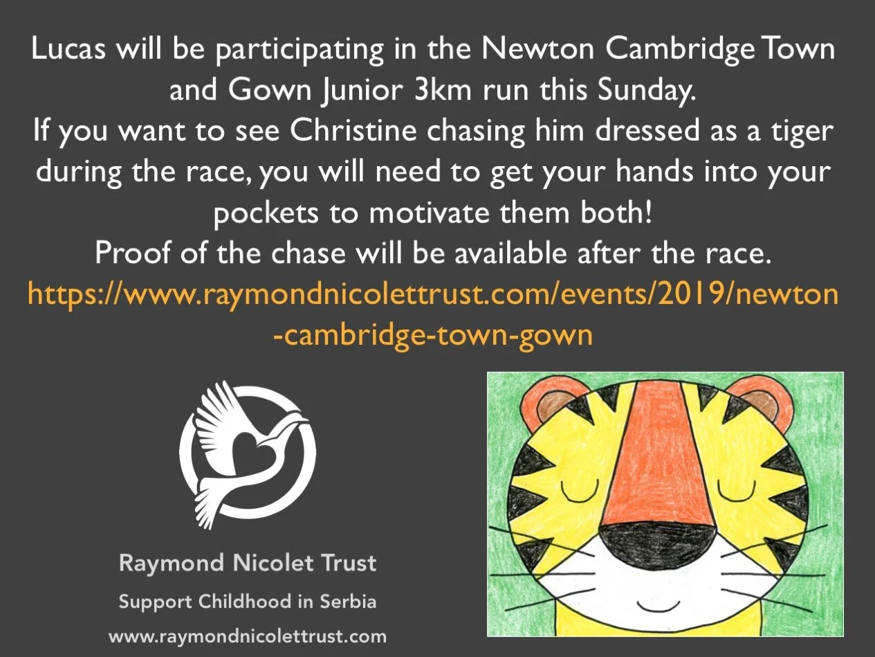 Lucas will be participating in the Newton Cambridge Town and Gown Junior 3km run on Sunday 20th October 2019 in support of the Raymond Nicolet Trust to help education in Serbia.