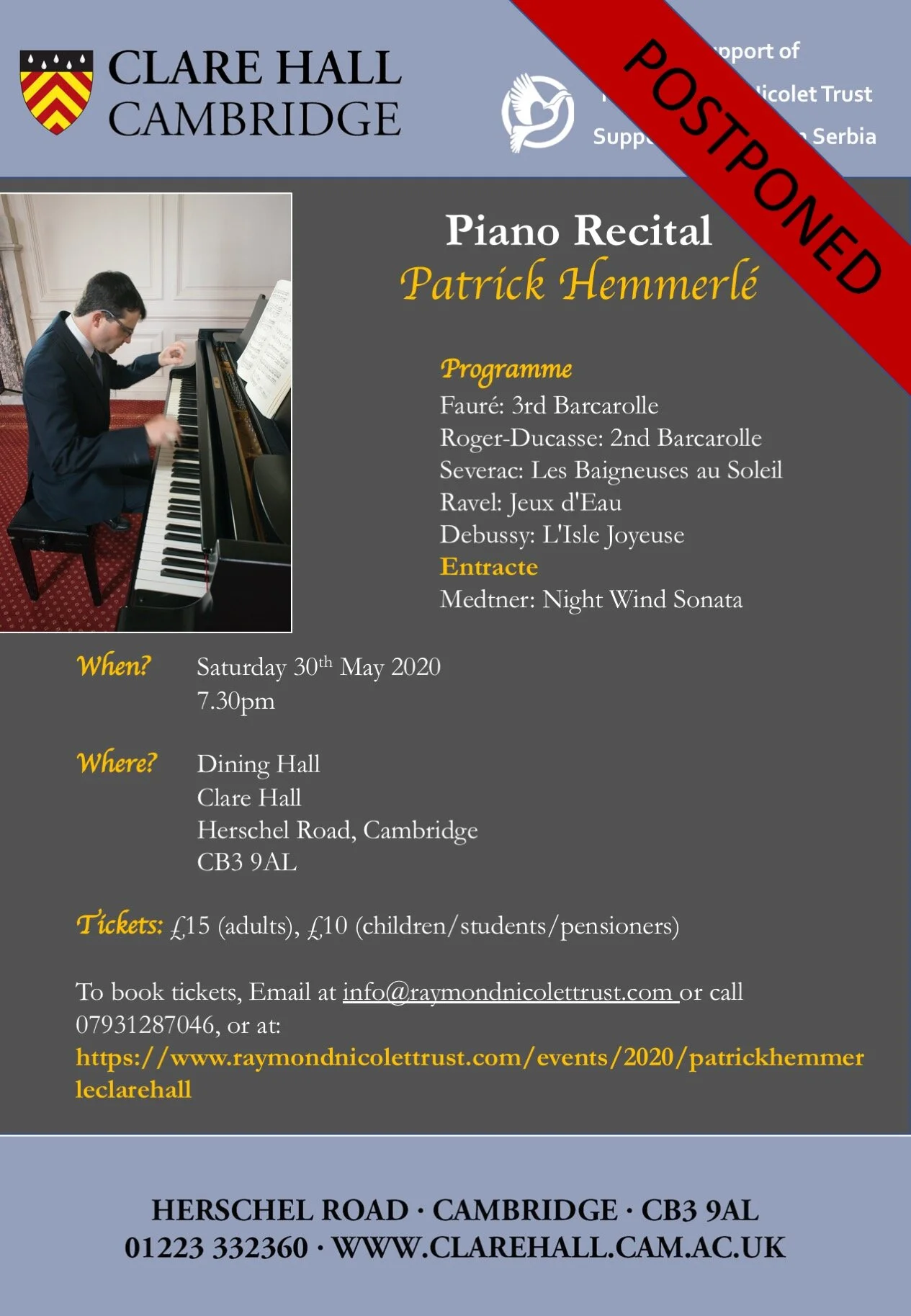 Award-winning French pianist Patrick Hemmerle will be playing again at Clare Hall, Cambridge, to raise funds and awareness for the Raymond Nicolet Trust on Saturday 30th May from 7.30pm.